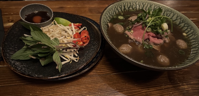 For dinner, Marco chose pho, a beef broth soup. (There are various kinds, but Little V only has beef broth). The best part is the beef comes out uncooked, as you can see on the right side. But you just dunk it in the broth for a few seconds and you’re good to go. It doesn’t need much time or heat.