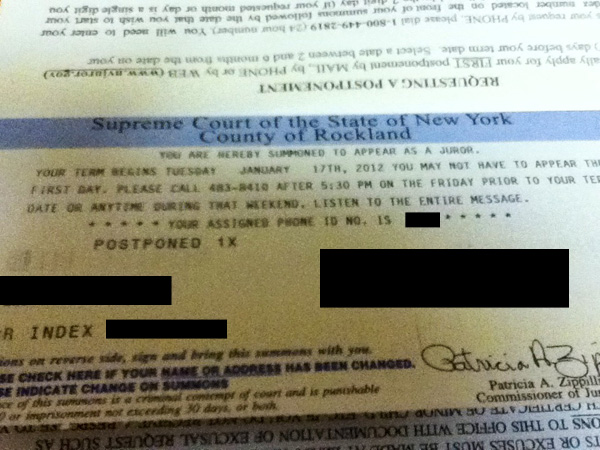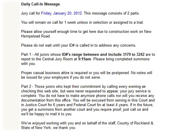 I have been on call for jury duty this past week for Rockland County’s courthouse in New City. I received the letter a few weeks ago, notifying me that I would be on call from Tuesday the 17th through Friday the 20th. Not everyone goes in on the first day – you call a phone number or check a website daily to see which jurors have to go in on each day, based on the number they assign you.