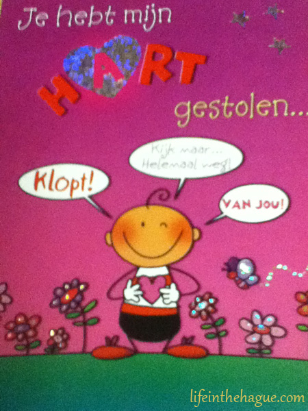 On the inside of the card he writes: “Today is October 16th. That means it is 3 days removed from our 5 year anniversary of first meeting one another. I’m sure neither of us realized how important that day would become. š And there were so many random factors at play that helped us to meet & hang out. … Anyways, I’m happy you walked into my life. I don’t plan on letting you walk out of it. xoxo. So let me wrap this card up in Dutch: Ik hoop dat je de kaart leukt vindt. (I hope you like the card.)”