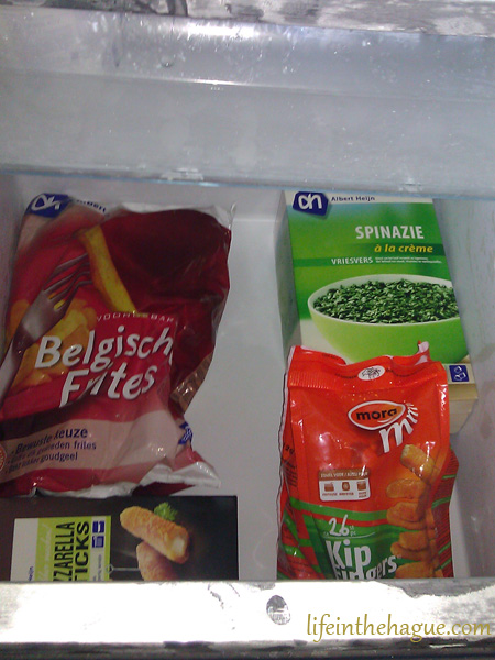 And finally a look at the freezer compartment, including chicken fingers, mozarella sticks, fries, and spinach. I do love kip (chicken)!