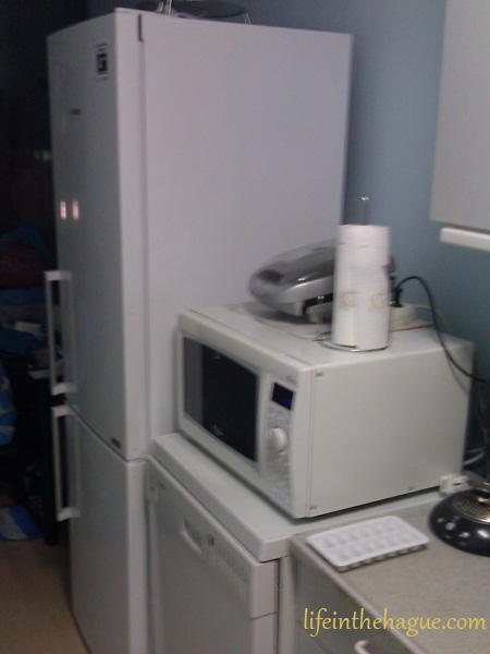 So in other news, Marco’s fridge arrived yesterday. It will take some getting used to having the freezer on the bottom, but otherwise it looks very cool. Unfortunately, it’s a bit too tall to have the microwave on top… but at least this way I can also use the microwave without having to stand on my tiptoes!
