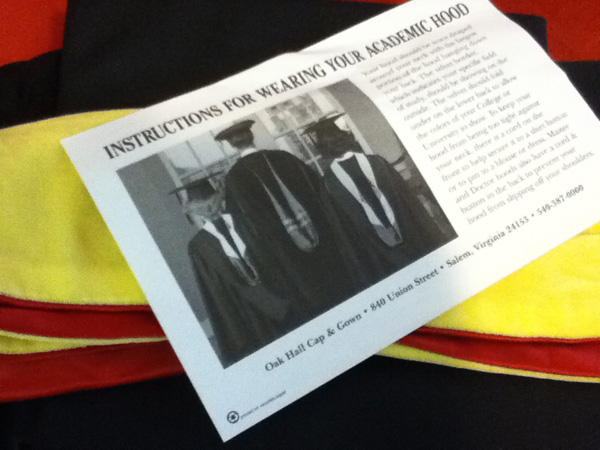 The cap and gown I will wear, with the rules for properly showing off the academic hood (the part that hangs behind you).