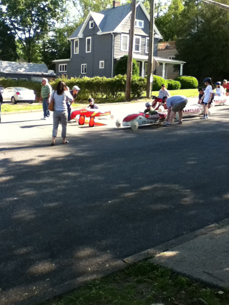 Also today was the soap box derby trials, where you race little cars down a big hill. Over and over and over. They block off the main road every year for this. I took a few pictures: