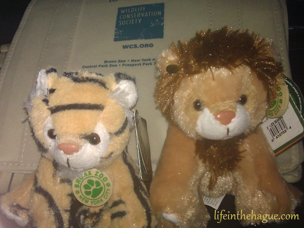 Note the Bronx Zoo tag around the tiger (so cute!) and a Bronx Zoo reusable bag that they came with behind them.