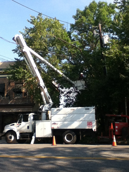 As I was walking to the post office today, I came across a service truck. The worker was in the middle of cutting down tree branches that were obstructing the power lines.