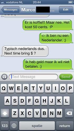 So I wrote: Er is koffie!!! Maar nee. Het kost 50 cents. 😛 (There is coffee. But no. It costs 50 cents.)
