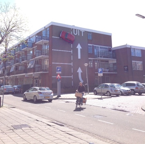 3 thoughts on “Unexpected art (Or: Car sideways on a building)