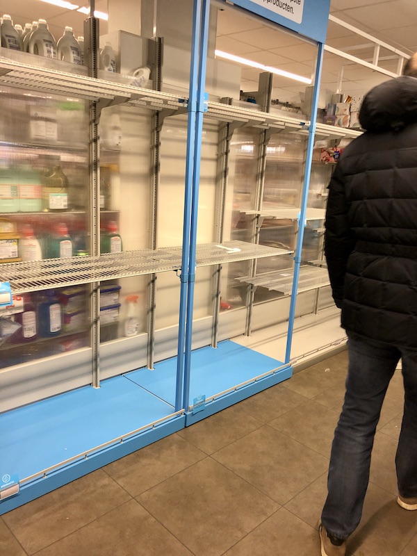 Of course, it doesn’t stop people from stockpiling. Here’s a look at an Albert Heijn at lunchtime yesterday: