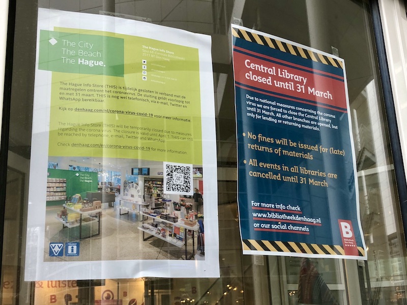 The photo above is now out of date. I took it this afternoon to show that the Central Library was closed, while the other (smaller) branches were still partially open. This was acceptable since generally only the Central Library would have more than 100 persons inside at any given time. But thanks to the new measures introduced by the Dutch government this evening, all branches are closed until 6 April.