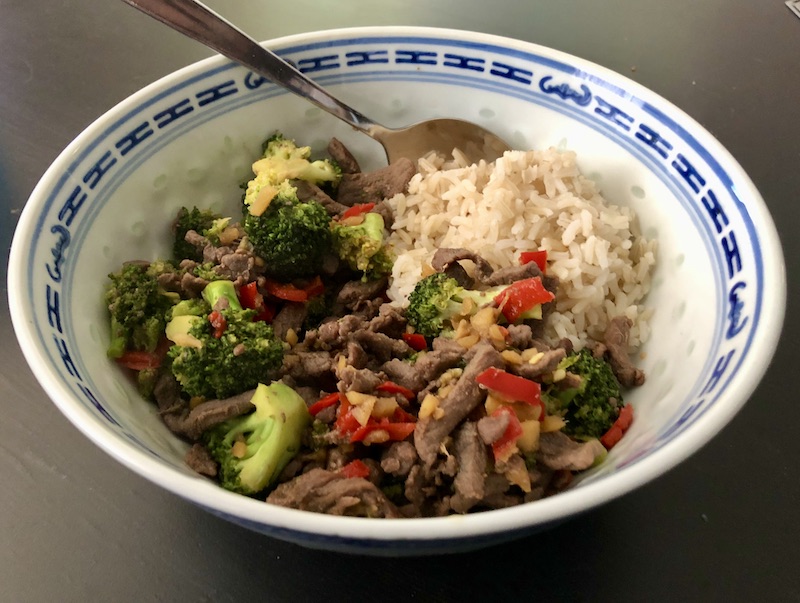 So let’s see, in the bowl you have: beef strips, broccoli, rice, red peppers (yum!), fresh garlic, fresh ginger and 4 tablespoons of soy sauce. It was nice and spicy thanks to the peppers, especially at the end. The broccoli and rice still had a bit of crunch to it, giving it a nice texture. I’m quite proud of it.
