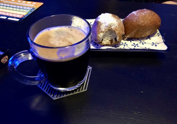 Preparing the goods… bag of oliebollen with a canister of powdered sugar. And here’s a look at the oliebollen with some coffee:
