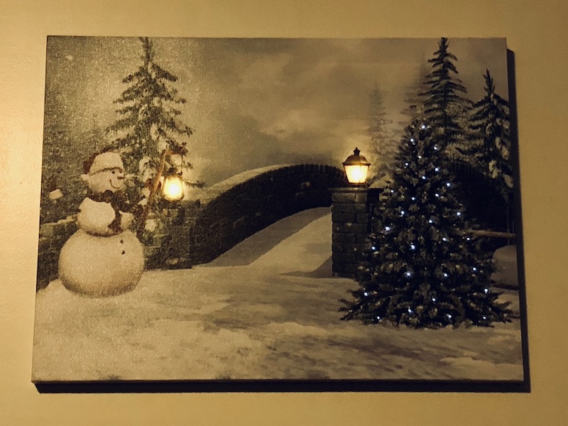 We haven’t put up the Christmas tree yet, but we do have one or two things out. Including a painting we brought last year (complete with LED lights):