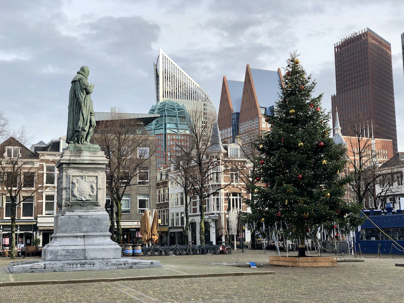 (Alternative Christmas tree in Maastricht at the “Our Lady plaza”.) Those are café/restaurant chairs. Since the cafés and restaurants are only open for takeout or delivery these days, why not re-use them (or store them) as a Christmas tree? The best part: In the back on the left of the photo you see the hint of another Christmas tree.