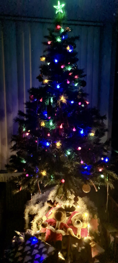 Here is our Christmas tree this year, the presents guarded by a reindeer and a bear: