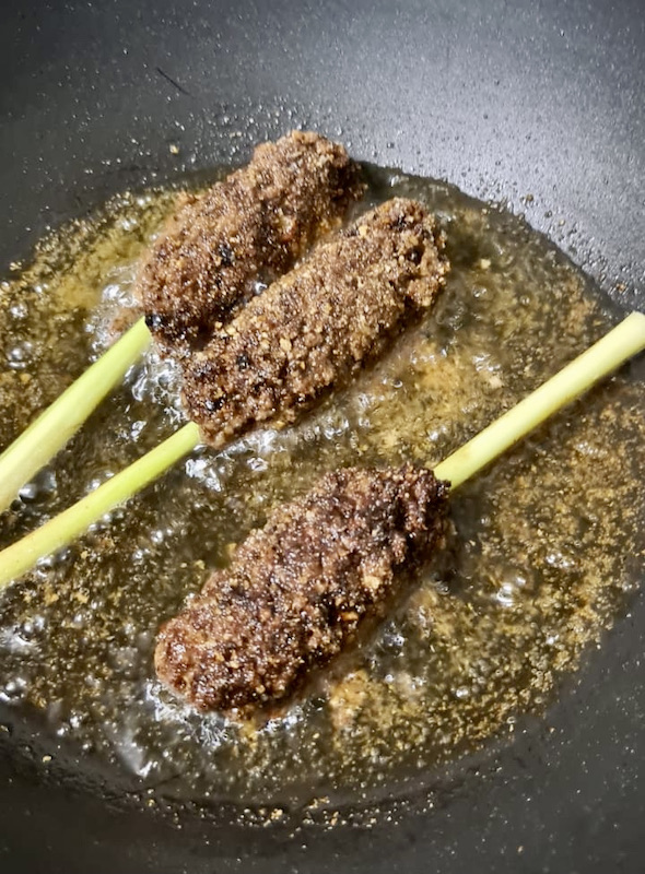 You then fry them in a wok in a thin layer of oil. This was the only annoying part, since we ended up cutting the lemongrass in half to handle them better. Some of them also had a tendency to fall apart.