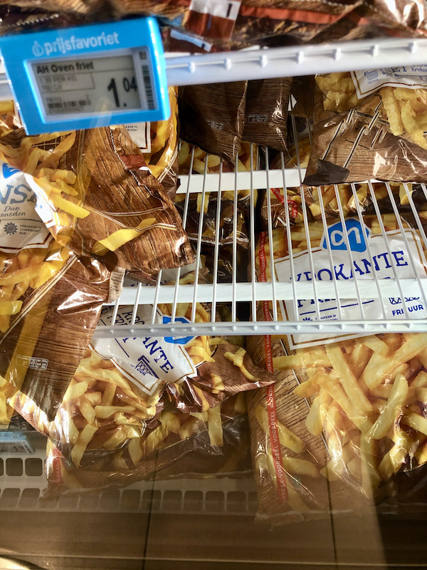 While purchasing crinkle cut fries for this dinner–yum, yum, yum–I noticed a large bag of fries at the bottom of the freezer at Albert Heijn, a Dutch grocery store. It was so huge it didn’t even fit on the shelf anymore.
