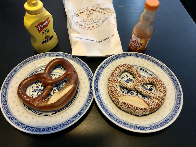Marco’s dipping sauce of choice with his sesame seeds pretzel was Frank’s buffalo wing sauce. Original and buffalo wing Frank’s have been available at Albert Heijn (the local grocery store) for a few years now. They don’t have my favorite extra hot variant anymore, though. I miss that one a lot! It is great on burgers.