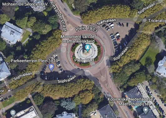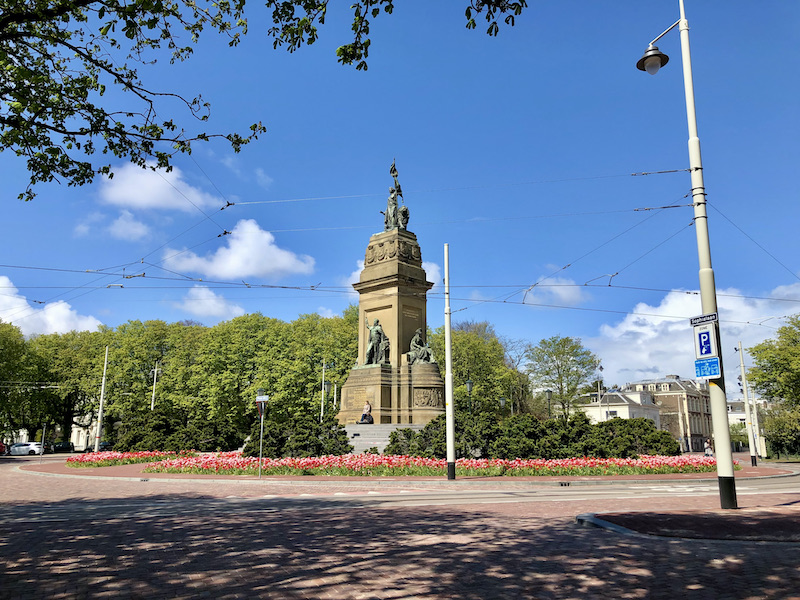 Plein 1813 is a monument commemorating the victory over Napoleon (denhaag.com, in English) and the end of the French era in the Netherlands. It’s a beautiful monument, surrounded by seasonal flowers that are replanted throughout the year in different colors. Traffic flows around both sides of the monument, providing a lovely view if you are taking tram 1 to Scheveningen.