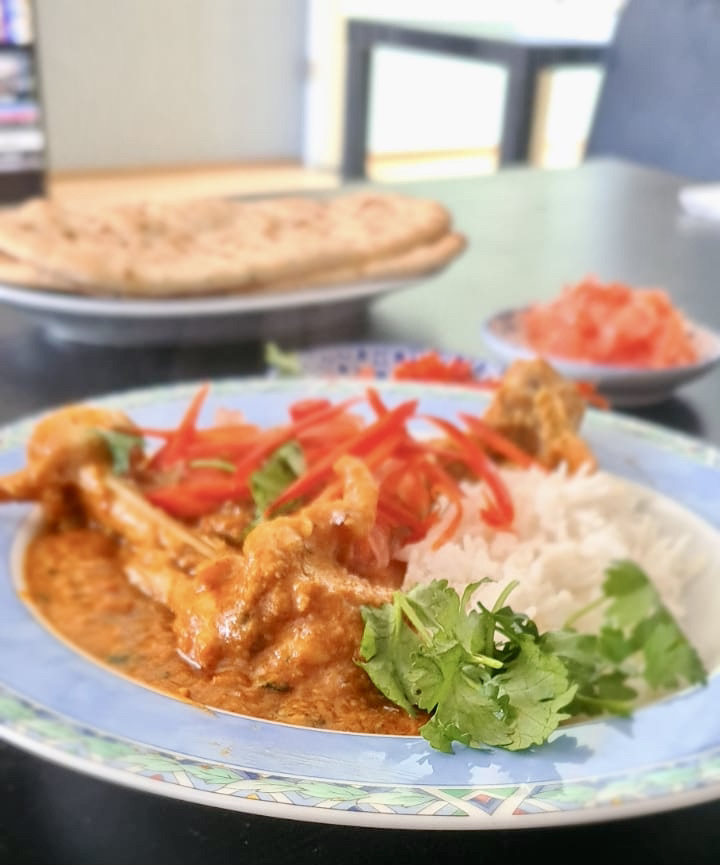 On Friday Marco and I cooked Kolhapuri chicken curry, a spicy, flavorful meal accompanied by naan bread. We found the recipe in our “Indian Food and Cooking” recipe book (Amazon.com link). The chicken joints were first marinated in yoghurt combined with chili powder, black paper, garlic, gram masala and more goodness. Top it off with some garnish (tomato, red pepper slices, fresh coriander) and you have a spicy treat.