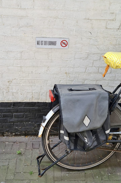 That doesn’t say “no bikes here” in German. It actually says “Where is the train station?”. That is a reference to a 1985 short, satirical Dutch film by the same name (the actual skit is only 2 minutes). Read more at this vpro.nl link (in Dutch). It is a common joke between Marco, Roger and I: “wo ist der bahnhof? …do is der bahnhof.”(Where is the train station? There is the train station!) See also the 2 minute skit at YouTube in Dutch.