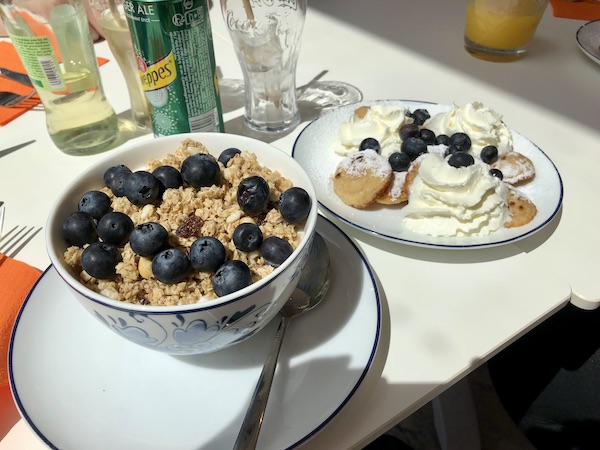 And finally, a bowl of yoghurt for me and a small plate of poffertjes (Dutch mini pancakes) for my sister-in-law. This was a restaurant very much themed towards tourists – I think there were about 15 orange clogs hanging from the wall. (Both pages link to English Wikipedia.)