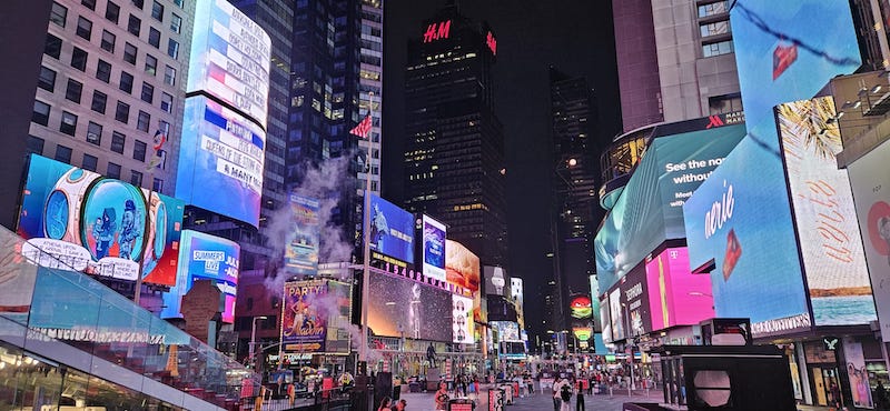 Statues by the waterfall at W 48th street, between 6th and 7th avenue. Read more about the hidden waterfalls in New York City here: https://www.businessinsider.com/hidden-waterfalls-parks-in-new-york-city-2016-7Times Square at 5am. Why were Marco and I up at 5am? We woke up early and heard there was a storm coming (which unfortunately cancelled our parent’s morning flight; they were re-booked to a flight later that evening) so we decided to get out and stretch our legs and also grab some breakfast for the hotel room in the process. It had started to rain when we got back to our room around 6am, so we timed it pretty well.