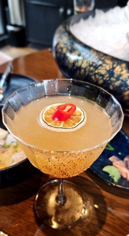 The following course, pictured above, consisted of a lomito yakiniku roll (beef, yakiniku sauce, avocado), four pieces of delicious mango maki (the best part was the sesame seed coating which gave it a lovely nutty taste) and a seabass ceviche (not pictured).