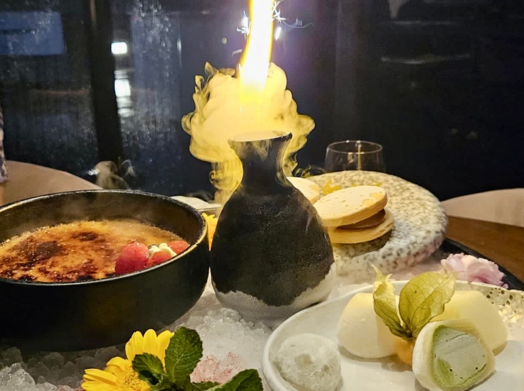 Three types of dessert, with a “feest fontein” firework (literally a “party fountain”) for a nice show. On the left was creme brûlée, in the back was two alfajores cookies with dulce de leche in the middle, and on the right there was mochi.