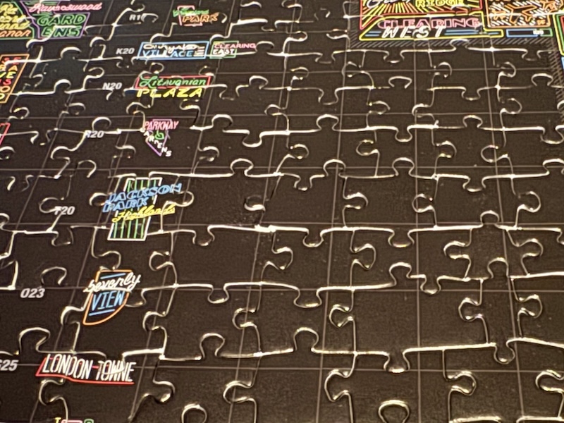 The left side and the bottom have a list of streets so you have a sense of where you are at the city as well. They were all but impossible to read on the box (since the old version didn’t come with an enlarged version of the puzzle on paper and you have to make do with only the picture on the box). After I finished the puzzle I made my life easier and created an Excel spreadsheet with the street names in the grid. That way if and when I do this puzzle again I at least know what the order of the streets should be!