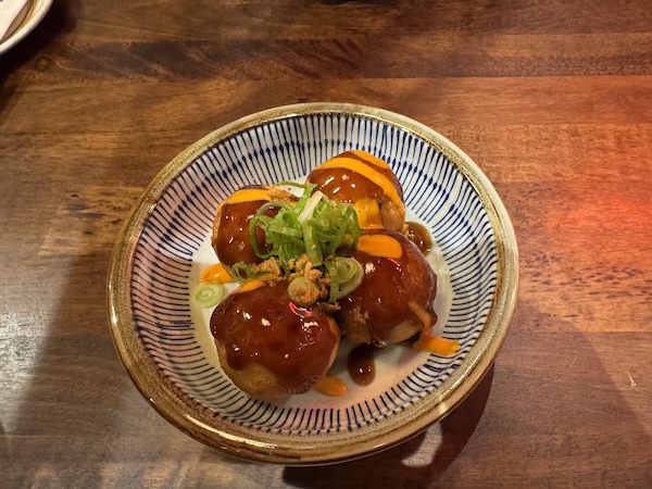 It was softer than I expected (perhaps due to the amount of takoyaki sauce on top). The sauce is descended from Worcestershire sauce which the British brought to Japan in the 1800s. There’s also a bit of Japanese mayonnaise, the orange color on top.