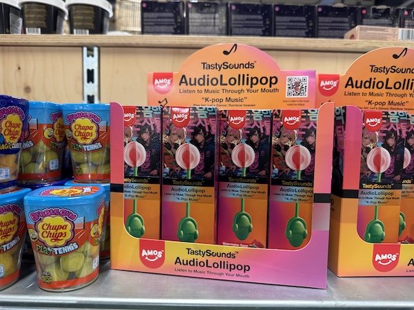 These lollipops feature K-pop songs. They come with a pair of bone connector headphones. You press a button on the device and then take a bite of the lollipop. It sends music through your teeth (!) and your skull to your inner ear. It’s not new technology – bone connector headphones have existed for a while, although I have never tried them. You can also read more about the lollipops at Amazon.
