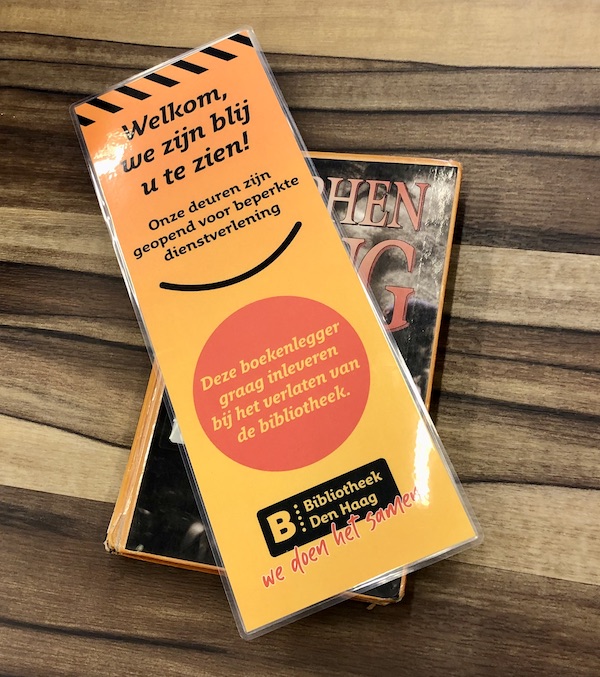 The giant bookmark says: Welcome, we are happy to see you! Our doors are opened for limited services. Please return this bookmark (boekenlegger) when you leave the library.