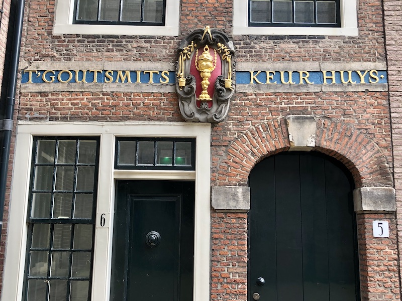 The building was built in the first part of the 17th century (Dutch Wikipedia). All that remains is the facade you see in the photo; behind is office spaces. There is a bit of an embarrassment from centuries ago: the gold text has a typo. it reads t’ Goutsmits Keur Huys but even back then the apostrophe should come before the t, as an abbreviation for het or “the”. If you look at the photo on the linked Wikipedia page you can see just how cramped this building is, surrounded by buildings constructed in the 20th century.