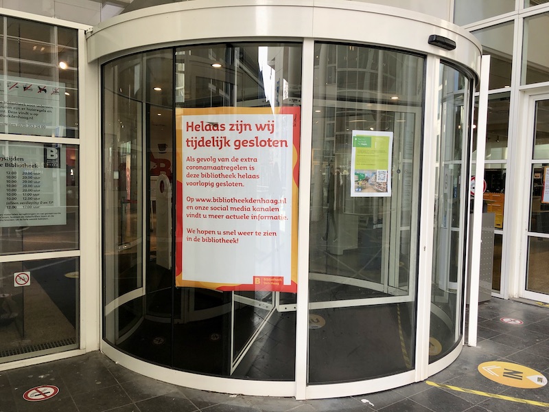 Libraries (and museums, theaters, cinemas, etc.) are currently closed in the Netherlands. It is part of an additional set of corona measures that the Dutch government has taken to lower the number of hospitalizations. (The government did provide an exception for libraries to be open for picking up reservations and book deliveries, but The Hague has chosen not to do this.)
