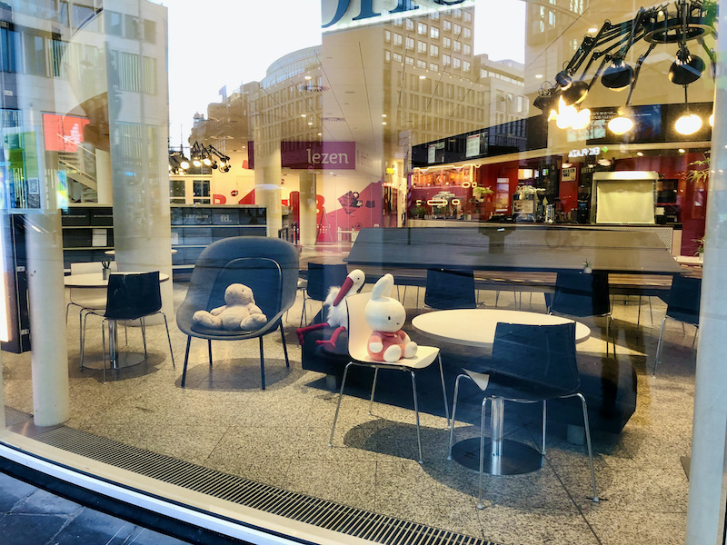 As you can see a few stuffed animals were allowed to enter the library even if humans can’t. I can imagine they were waiting for cups of chocolate milk. The character on the right is Nijntje (in English her name is Miffy, see also the English Wikipedia article). She also has her own official website: miffy.com. The character in the middle is a stork, which appears in a lot of The Hague imagery, including in its coat of arms (English Wikipedia). I assume the stuffed animal on the left is simply a rabbit, but who knows. Maybe that is a famous character as well.