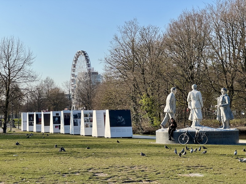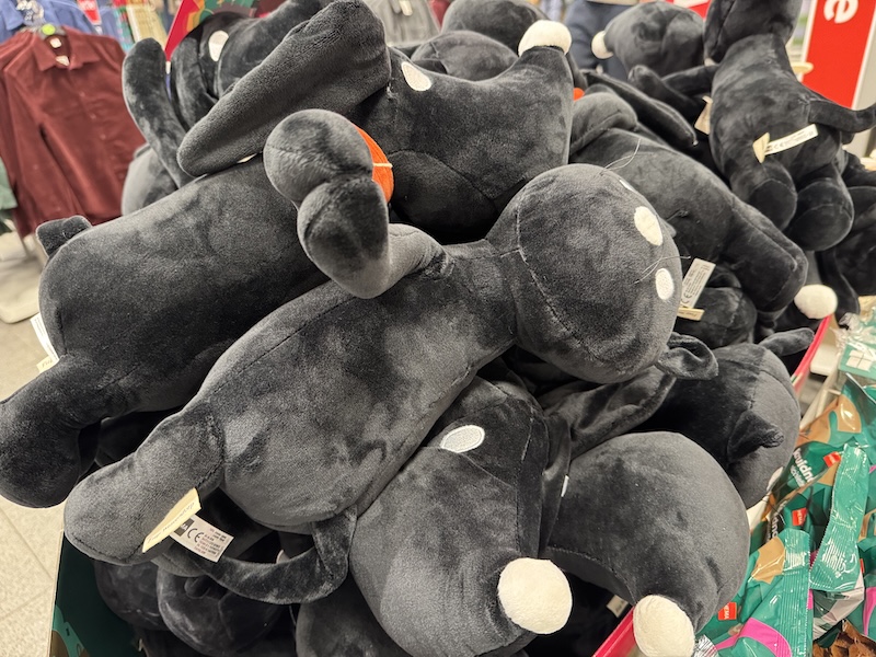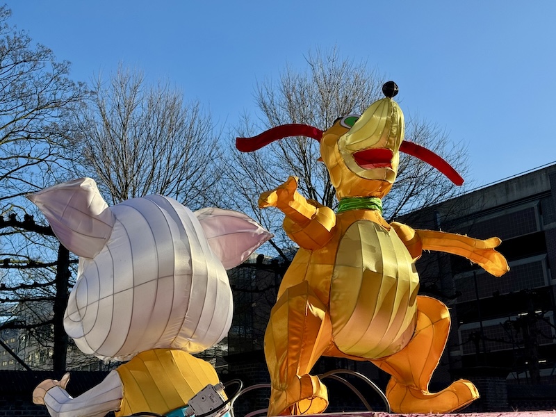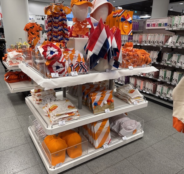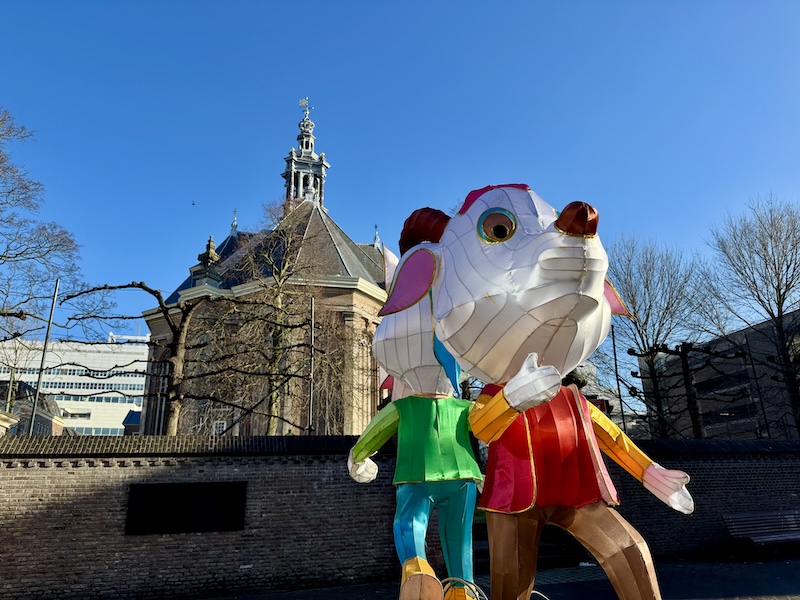 I do like the use of colored lights this year. A lot of places in the Netherlands only have soft white lights. The gold symbols on the tree are pictures of a teddy bear, Bijenkorf shopping bag, and Christmas present. The longer rectangle one is the symbol for the Bijenkorf in Amsterdam. You can also buy it as a Christmas ornament…