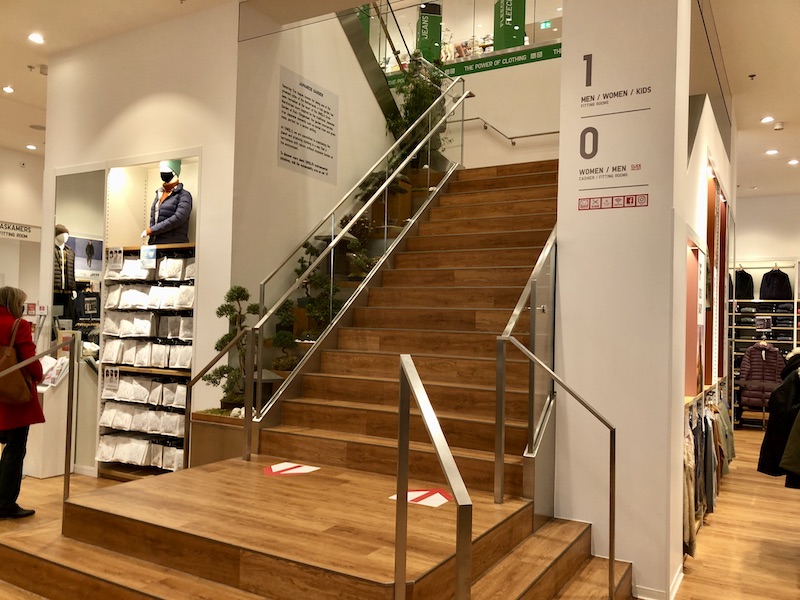 The sign on the wall reads: “Honoring The Hague, known for being one of the greenest cities of The Netherlands, a real garden has ben recreated at the heart of the UNIQLO Grote Markstraat store. Inspired by the traditional Japanese Garden at Park Clingendael, the garden incorporates true Japanese elements such as bonsai trees and green moss, perfect for a serene setting. At UNIQLO, we are committed to maintaining the planet and producing clothing in a way that is harmonious with nature, without excessive burden on the environment. To discover more about UNIQLO’s environmental initiatives, visit the sustainability area on the 1F.”