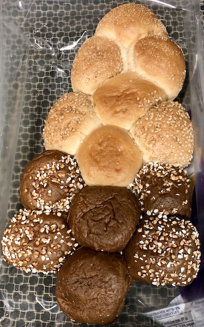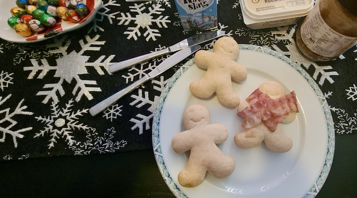 This was round one — the highlight for me was the pulled chicken (at the bottom), while the highlight for Marco was the maple-glazed bacon on Marco’s plate at the top. And I even had a bit of scrambled eggs, which is something that only happens every few years at most. Other things on offer were little pancakes and Belgian waffles.