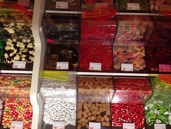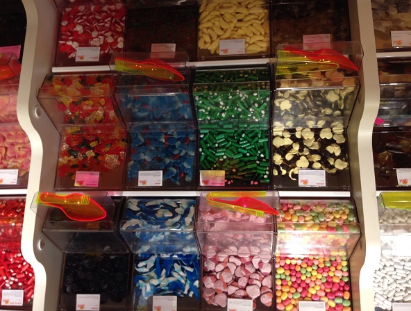 As you can see it is not that much different from the setup of a typical American movie theater – similar candy is offered there as well. The one thing I was tempted by were the sour bears on the left side of the 2nd picture, near the bottom. Yum, sour candy!