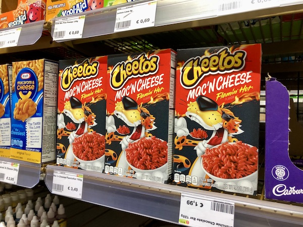 Above: Flaming hot Cheetos Mac’n Cheese from Kelly’s expat shopping. I have heard of combinations, but this might take the cake. It is interesting that it has a different pasta shape than mac’n cheese normally does (more fusilli-like). I am sure this version will stain your lips red…