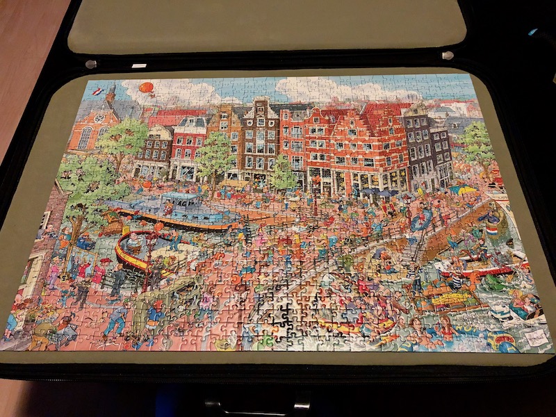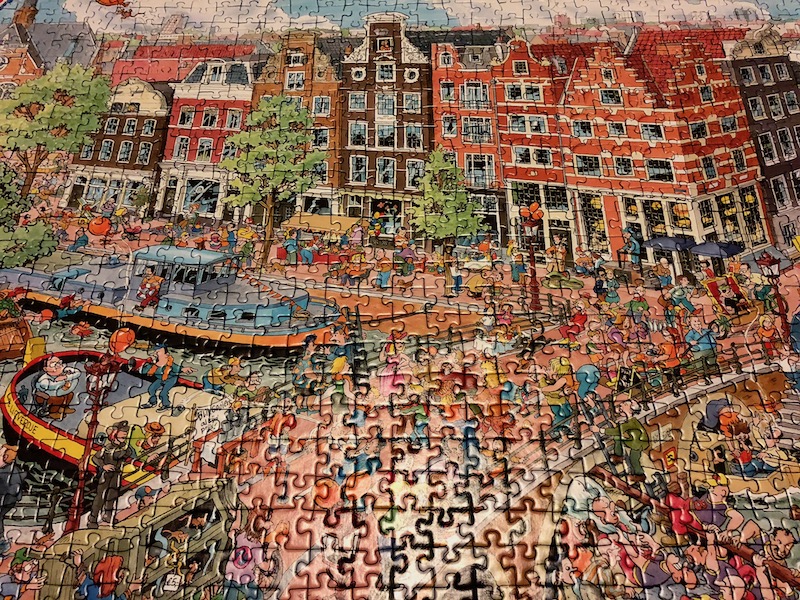 I recently finished a 1000-piece puzzle of Amsterdam — a present last year from Roger. And indeed, the puzzle sat in the ‘puzzle holder‘ for a good 5 months before I was able to finish it. The puzzle itself shows the corner of Amsterdam’s Prinsenhof where it meets Brouwersgracht, on King’s Day – hence all of the orange-clad characters.