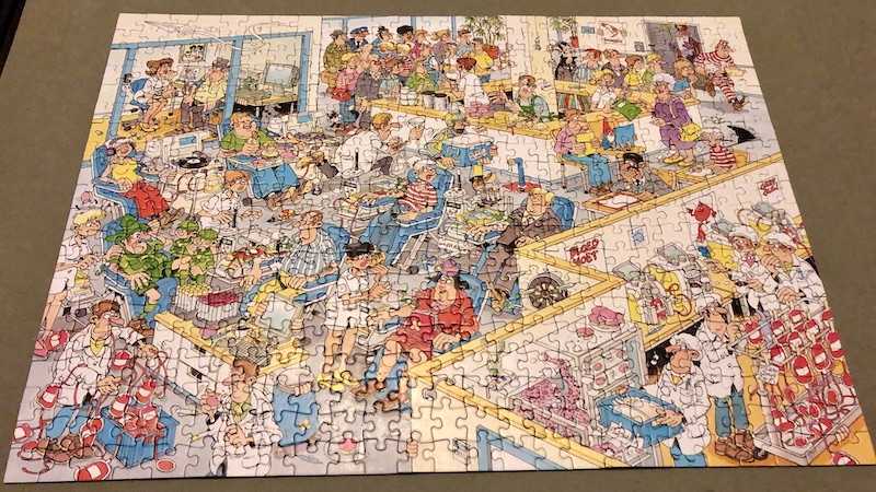 Some months ago I was able to choose a gift for donating blood for the 15th time. I could not pass up the jigsaw puzzle that I saw – a 500 piece puzzle from Jan van Haasteren!