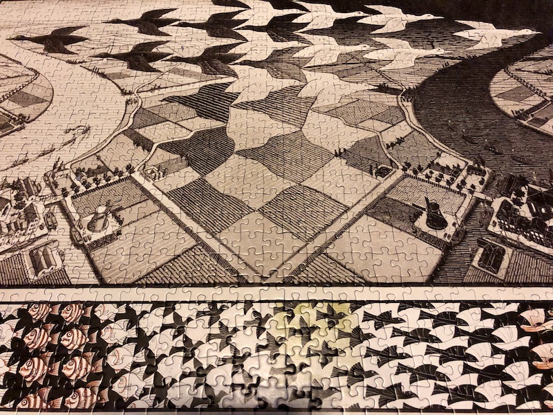 Marco gave me a puzzle for Christmas—it might have been Christmas 2021, even!—that has proven challenging to say the least. I worked on it for months, off and on. This puzzle was one of the main reasons I bought a pair of reading glasses. A lot of pieces look like each other. Even though you can see two shades of brown below, if you put the pieces next to each other it was hard to tell what shade it was. It reminded me of the dress color controversy (Wikipedia).