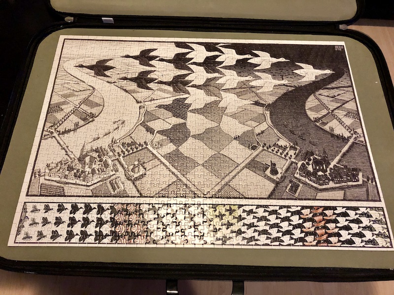 Okay, the title makes it sound like I do puzzles all the time, but that isn’t the case. I tend to take too long to finish one, so I lose interest for a while and it sits in its puzzle “briefcase” (bol.com) under the couch for way too long.