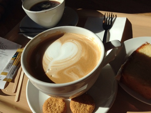 coffee and cappuccino (the lemon cake is hiding in the shadows to the right)