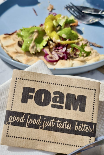 On Sunday Marco and I spontaneously booked a reservation for FOAM restaurant here in The Hague. That’s the same restaurant where we get FOAM at home meals on Fridays. I had resisted making an appointment earlier in the week as it was forecasted to rain, but the sun was out in full force Sunday morning so I said we should give it a try. We got a seat on the terrace outside at the front of the restaurant. (Here in the Netherlands you are currently only allowed to eat outside on a restaurant terrace, not inside the restaurant.)
