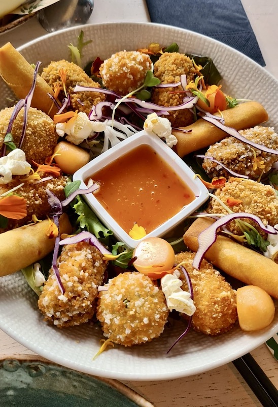 The snack attack platter, comprised mostly of croquette/bitterballen type snacks, plus 4 spring rolls. The croquettes are filled with meat paste or ragu. The quality of these snacks can differ greatly based on the restaurant you are at, but luckily upscale dining restaurants use high quality meat. In this case the croquettes were green curry, chicken satay, shrimp, duck and rendang. But as they say you also eat with your eyes – the photo above just begs to be eaten (and to be photographed).