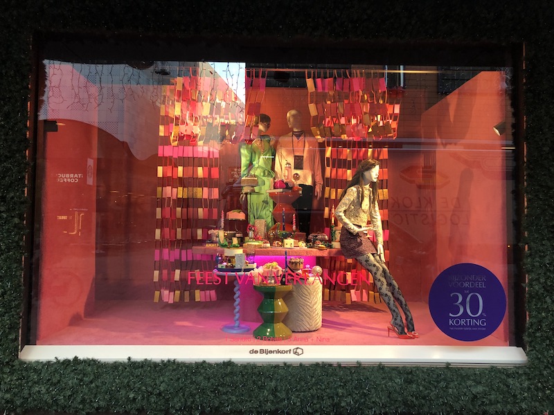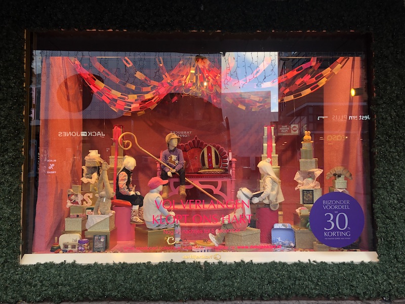 Bijenkorf is a high-end department store comparable to Macy’s in the US. Every year they hang up some gorgeous holiday lights and they decorate their store front windows for Sinterklaas (5 December holiday) and Christmas. The lights went up in early November this year, even before we left for New Year City. Here’s a look at a few of their Sinterklaas themed windows.
